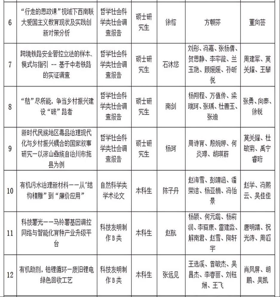 根据云南省第十三届“挑战杯”大学生课外学术科技作品竞赛相关工作安排,经自主申报、学院(学部)推荐、专家两轮评审,拟推荐《“行走的思政课”视域下西南联大爱国主义教育现状及实践创新对策分析》等15个作品参加省级竞赛。现将拟推荐项目名单公示如下: