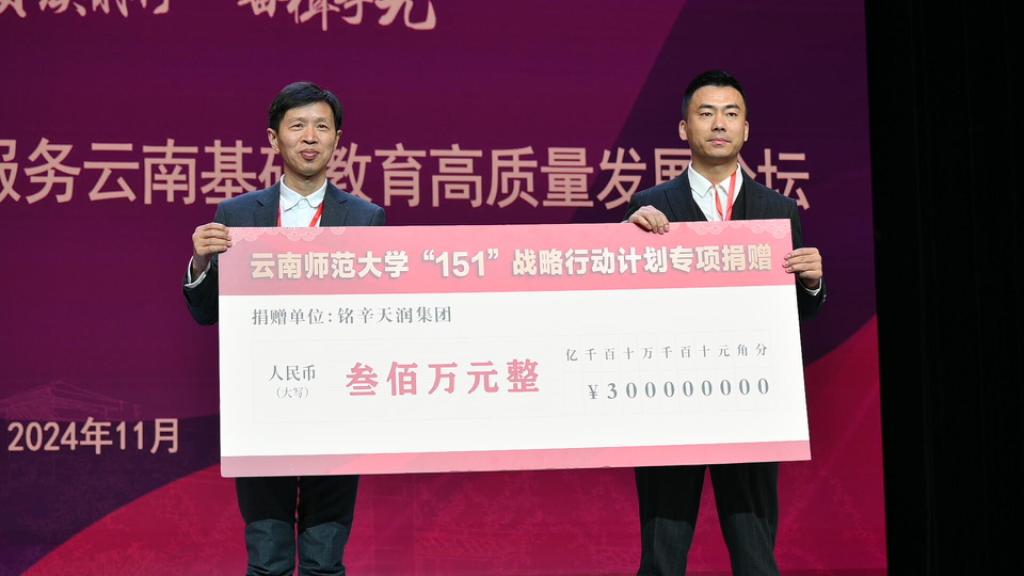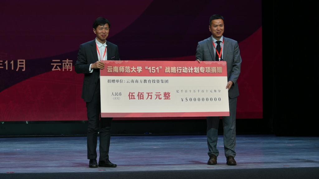 图说//云南南方教育投资集团总经理徐红卫代表学校81级物理系校友董事长兰靖,在论坛现场向学校捐赠人民币五百万元,用于支持学校教育领域项目建设和基础教育领域服务能力提升,校长胡金明代表学校接受捐赠并颁发捐赠证书。