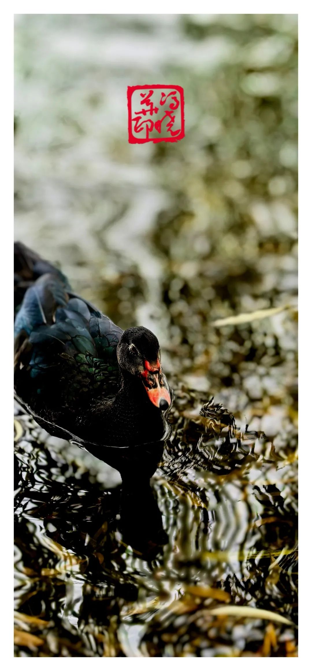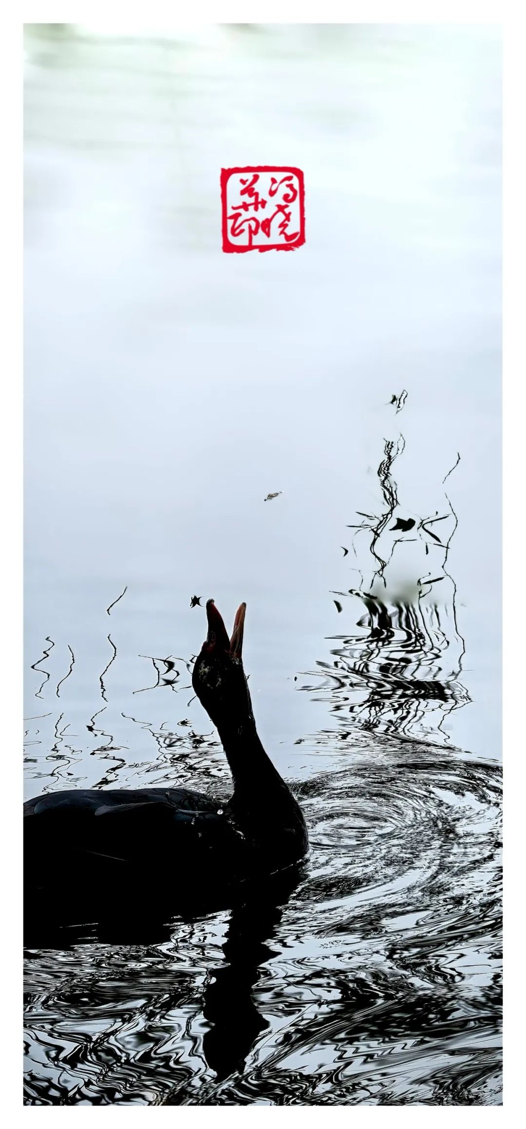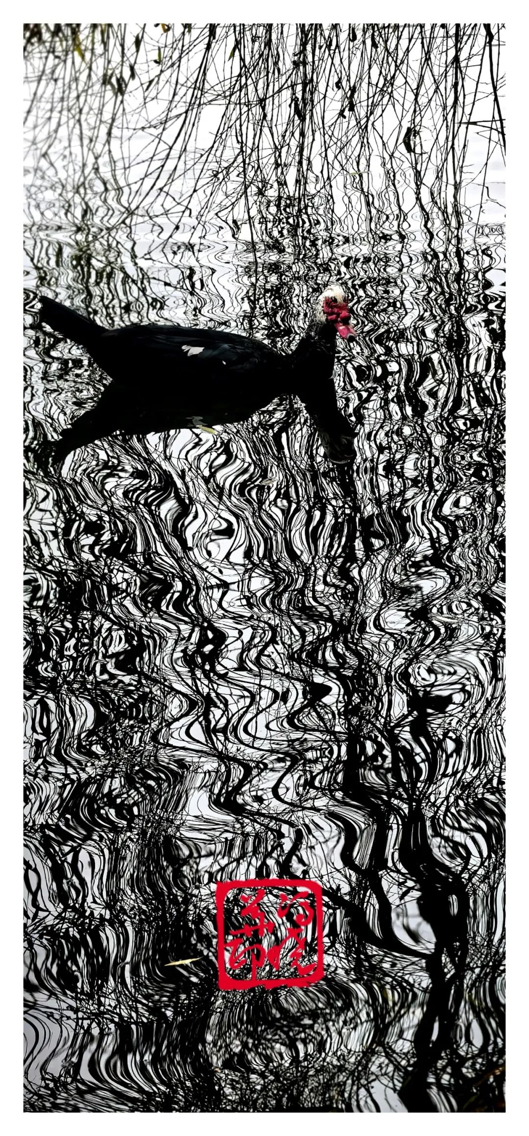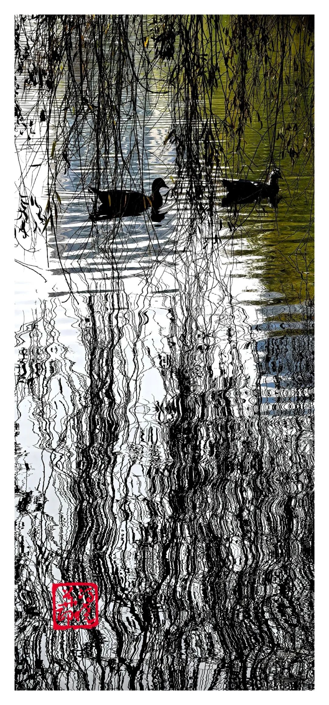 优雅的身姿与宁静的水面叠影在垂柳的包裹中