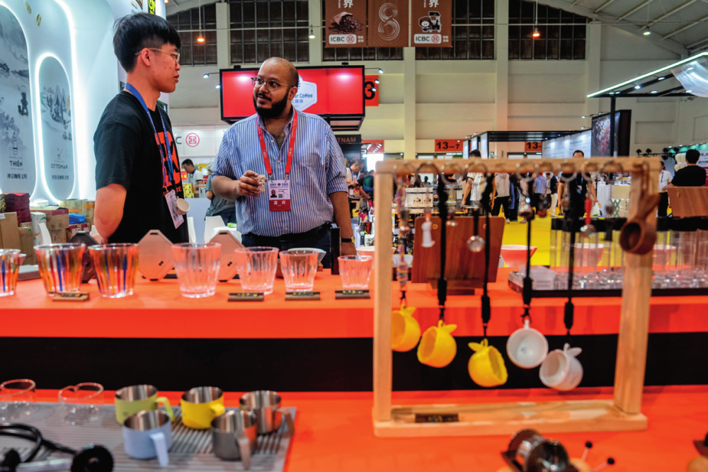 在南博会咖啡产业馆,一名外国嘉宾向展 商咨询咖啡冲泡器具(2024 年 7 月 24 日摄) 胡超摄/本刊