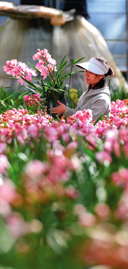 在昆明金才农业科技有限公司种 植基地,工作人员在查看大花蕙兰生长情况(2024 年 11 月 25 日) 彭奕凯摄/本刊