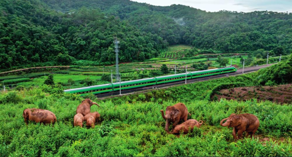 “然然家族”和“短鼻家族”象群在云南省西 双版纳傣族自治州景洪市大渡岗乡活动时,一列复兴号列车从中老铁路上驶过(2024 年 8 月 8 日摄) 胡超摄/本刊