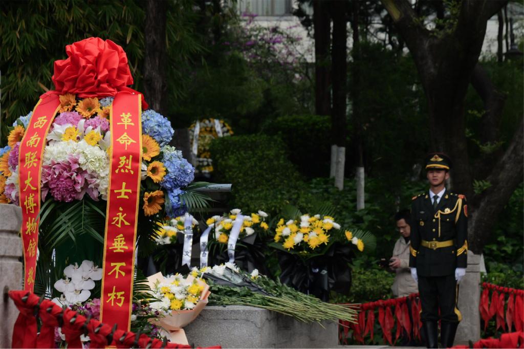 伴随《献花曲》,仪仗队向烈士敬献花篮,昆明警备区司令员张钦锋,昆明市委常委、昆明警备区政治委员吴正良,昆明警备区副司令员谭仲春,昆明市退役军人事务局局长朱伟上前整理缎带,缎带随风飘动,寄托着对先烈们无尽的追思。