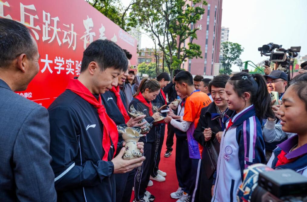 学生送瓦猫与奥运冠军交流切磋