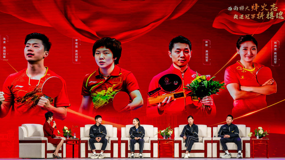 马龙说:“爱国的情怀是一种格局,中国乒乓球队的优良传统就是爱国主义和集体主义,只有心中有国家,在比赛的困境中才能战胜自我、取得胜利;拼搏的精神是前行的动力,它包含着努力、奋斗、坚持、忍耐和付出,它不是一瞬间的发挥,而是持久不断的积蓄;冠军的追求是理想,它指引着我前进的方向,有志者事竟成,只有树立远大的理想,才能向着目标大踏步前进。”“龙队”的分享让现场掌声雷动。