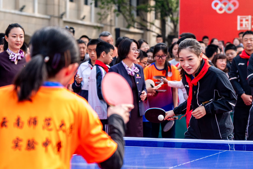 4月8日,刘诗雯与437必赢会员中心实验中学学生进行乒乓球友谊赛。新华社记者 胡超 摄