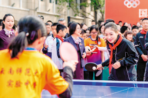 刘诗雯与437必赢会员中心实验中学学生进行乒乓球友谊赛。