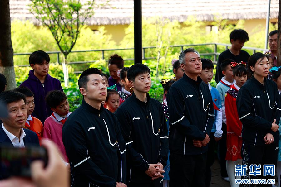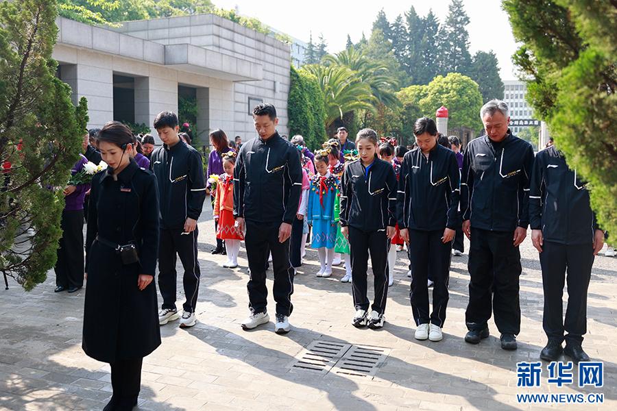 奥运冠军马龙、许昕、刘诗雯、李晓霞在“一二·一”四烈士墓前默哀(4月8日摄)。新华网 徐华陵 摄