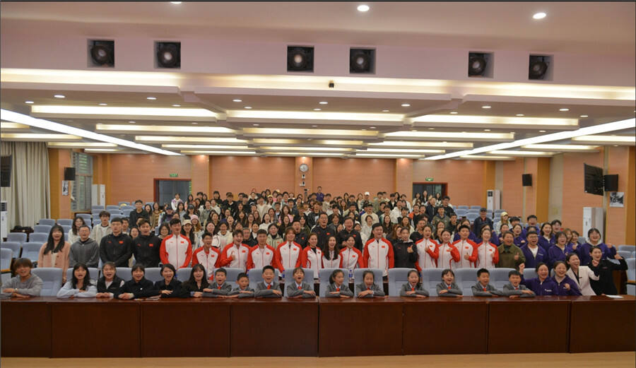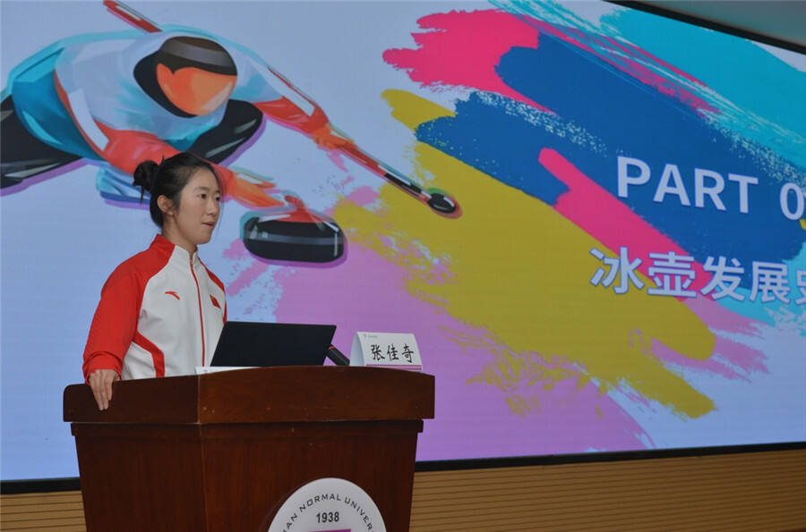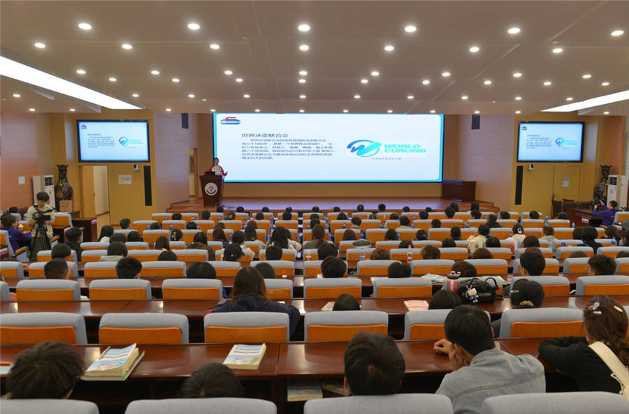 在专题讲座中,中国冰壶队优秀青年运动员代表张佳奇、费学清、韩雨介绍了国家冰壶队的建队历程和冰壶运动的基本知识,并通过精彩的影像资料展示冰壶运动的魅力。在互动环节中,学生代表与冰壶健儿近距离交流,热烈的问答互动激发了大家对冰壶运动的浓厚兴趣。队员还分享了各自拼搏奋进的成长故事。